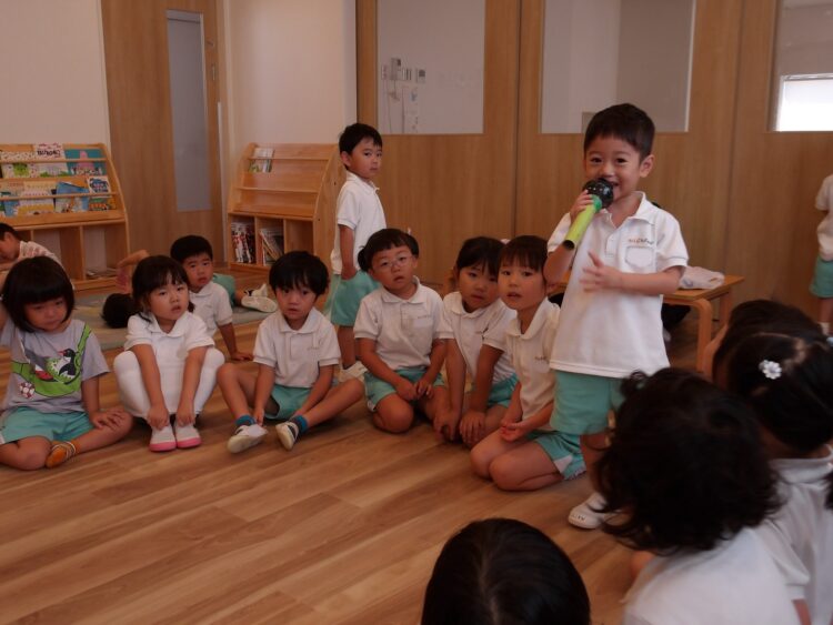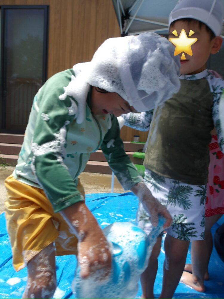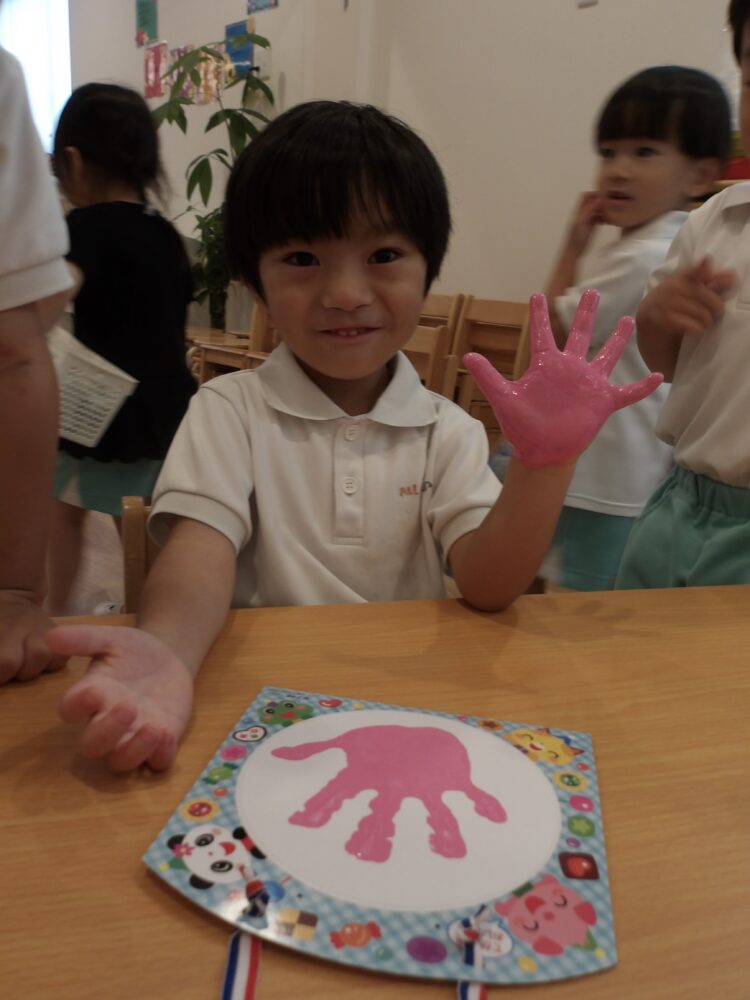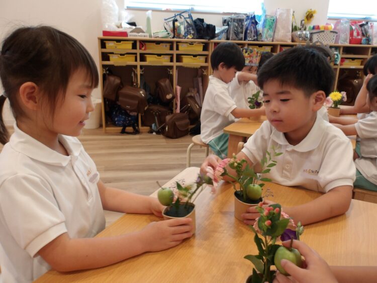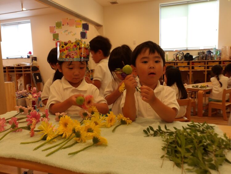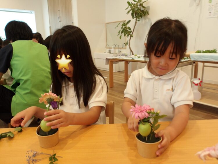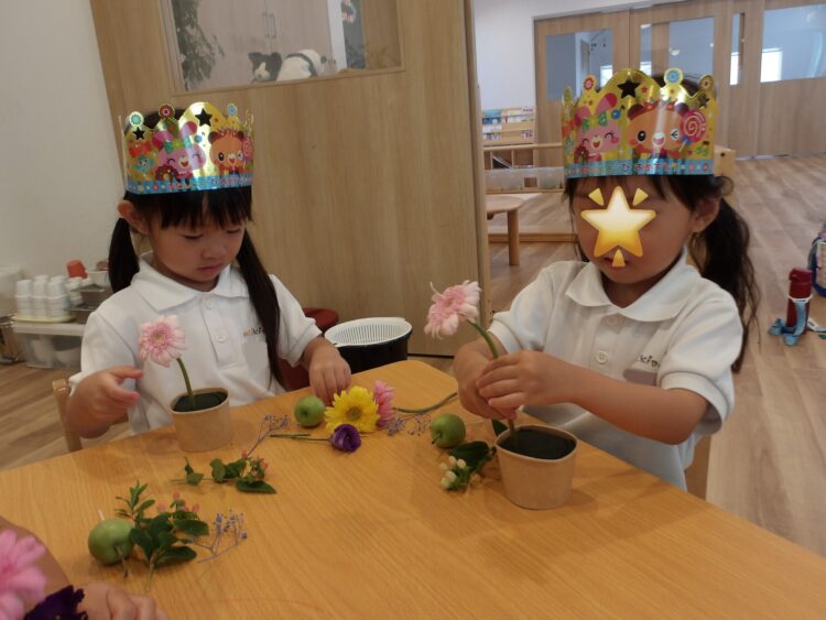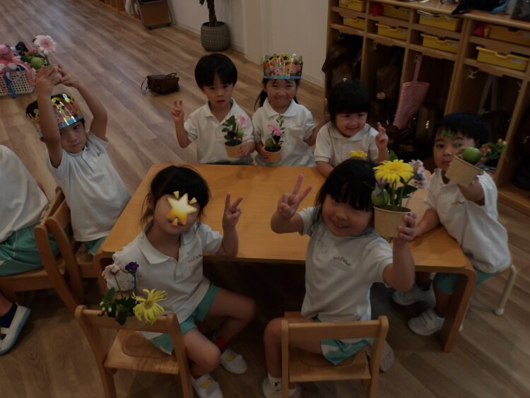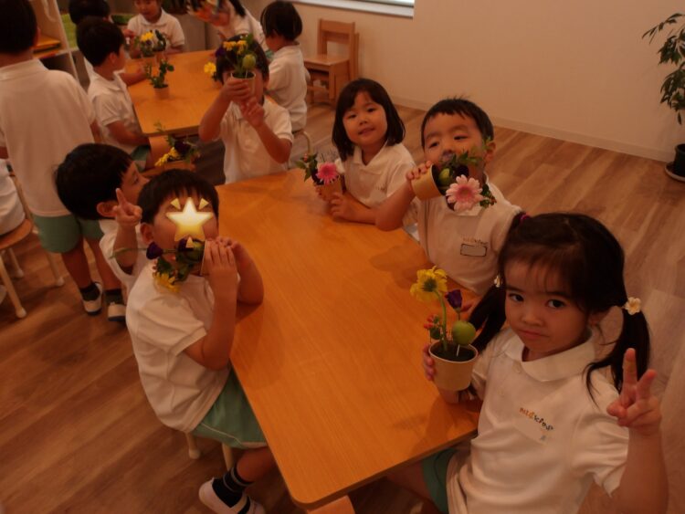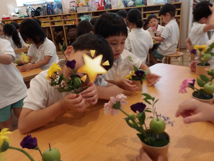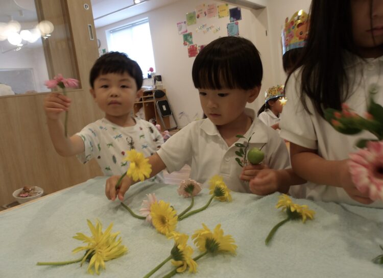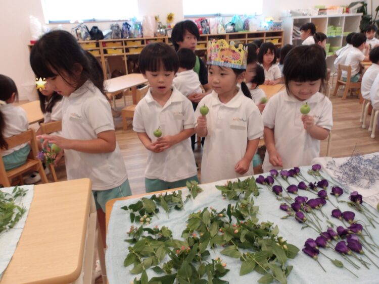 誕生日会で夏祭りの屋台をテーマにしたスケッチブックシアターを楽しんだあとだったので、〈姫りんご〉を持ちながらお花を選んでいる子どもたちの姿は、本当にお祭りに来たようでした🤭
