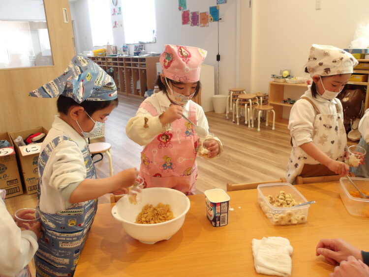 はじめに保育者が作って見せた後、子どもたちもクッキング開始♩