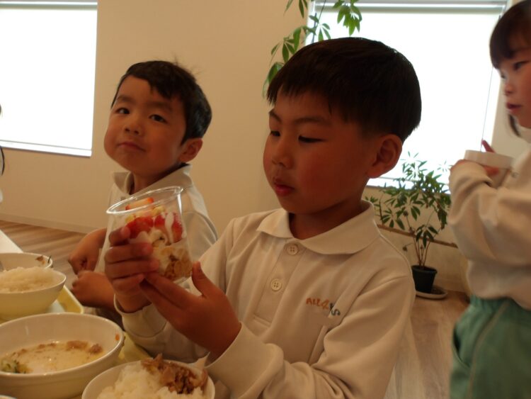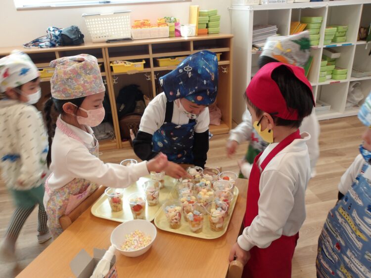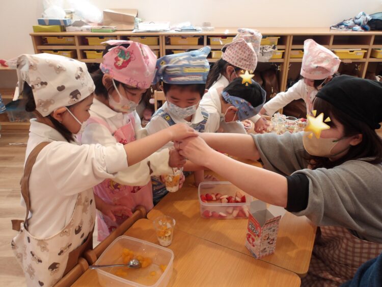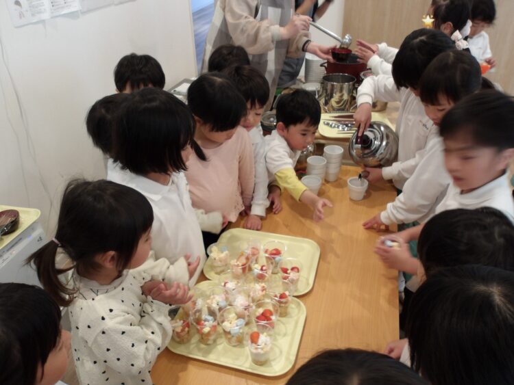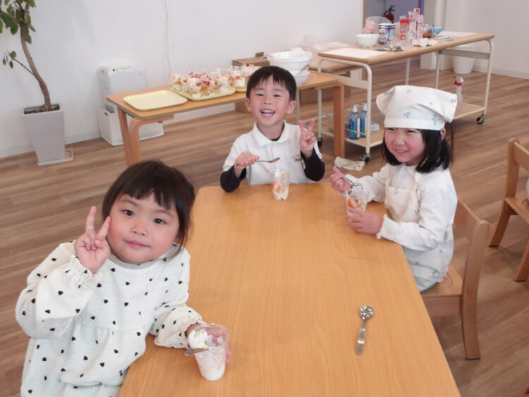 今日はスムーズに作ることができたので、給食までの時間を園庭であそんで、給食時にパフェを食べるか、今みんなでパフェパーティーをするか、どちらがよいか尋ねると、満場一致でパフェパーティーでした🤭