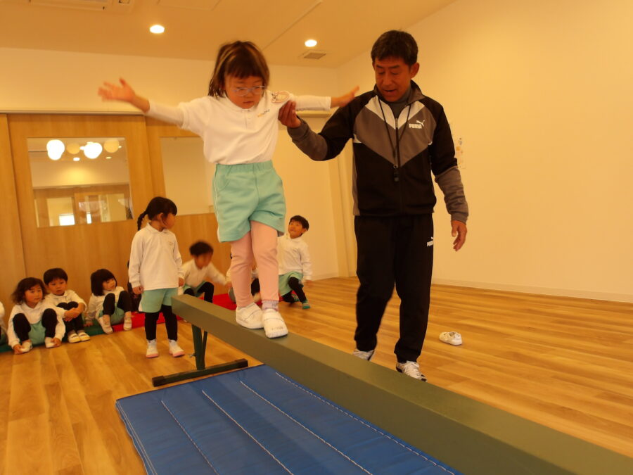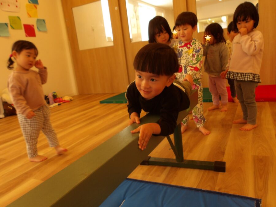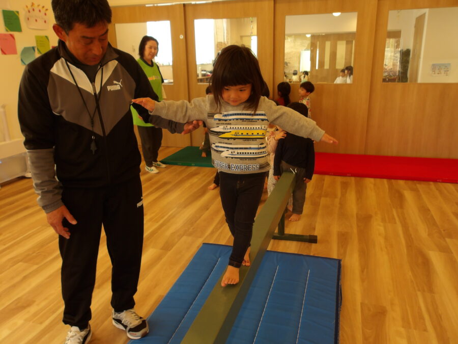 幼児クラスの子は障害物にある平均台に挑戦です。