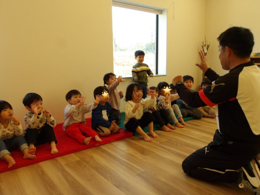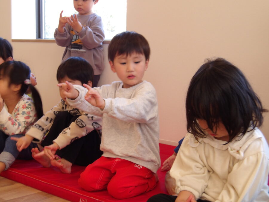 右手はグー、左手はパーでグーとパーを交互に変えていく手の運動あそびは講師を見ながら真似ていましたが、難しかったようです。