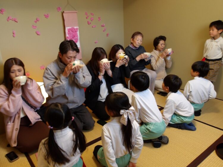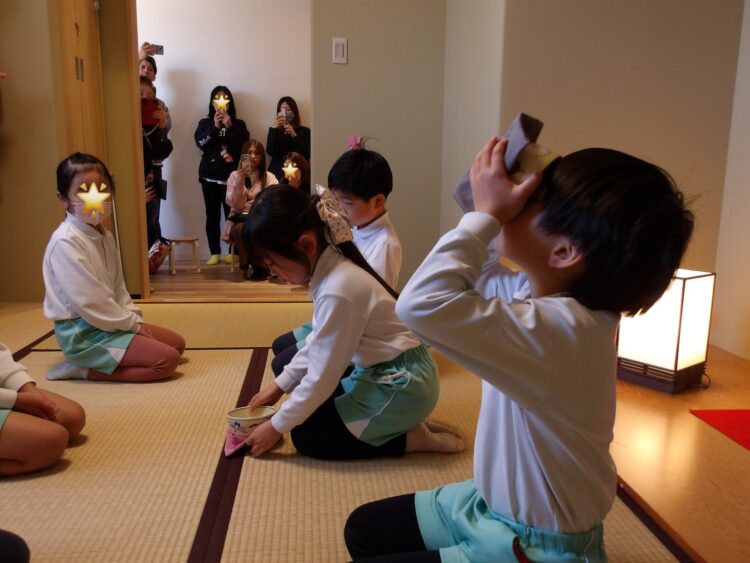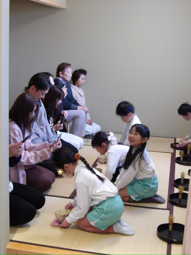 緊張しながらも心を込めてお茶を点てたり、お茶菓子の食べ方を教えてあげたり、「お茶碗は2回回すんだよ!」とお家の人にお作法を教えてあげる姿が見られました。