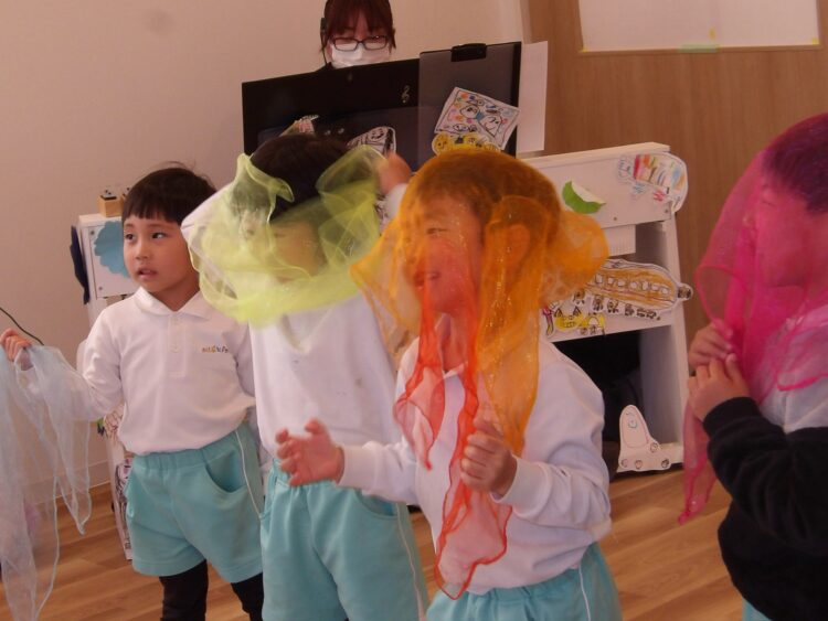 さて、今日のリトミックは春らしい楽曲に合わせてお花や虫になりきった子どもたちです。