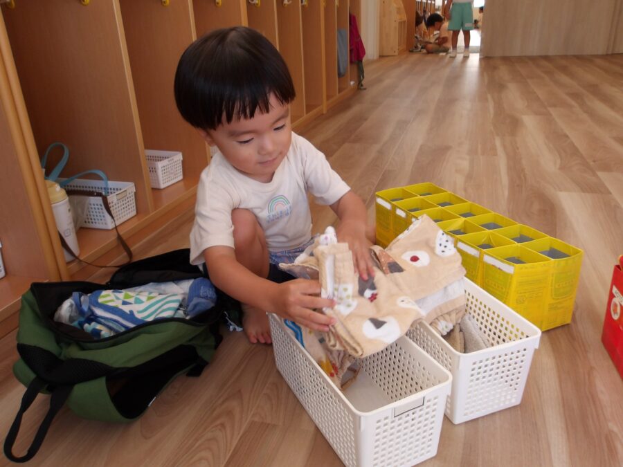 保育者が朝の支度をしていると、隣に来て朝の支度を始めたうさぎ組のお友だち。
