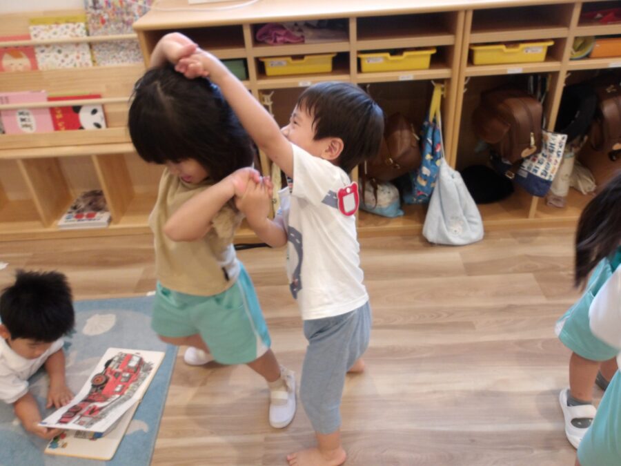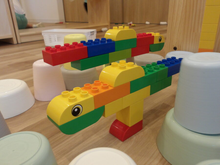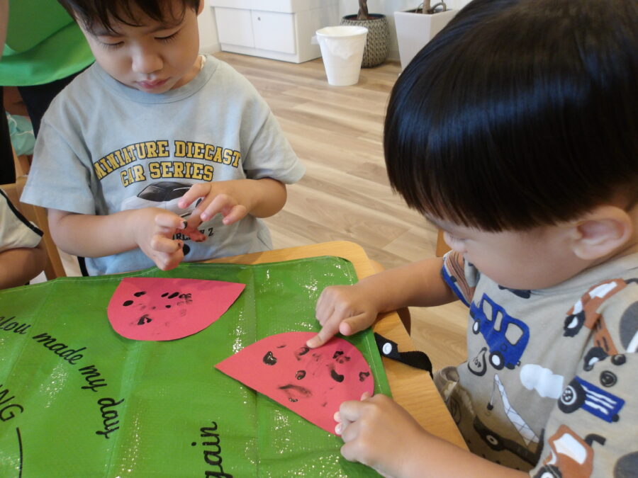 トイレットペーパーの芯で作ったスタンプやスポンジのスタンプで模様をつけてみたり、手や足でダイナミックに描いてみたりとみんな夢中になって楽しんでいました![]()