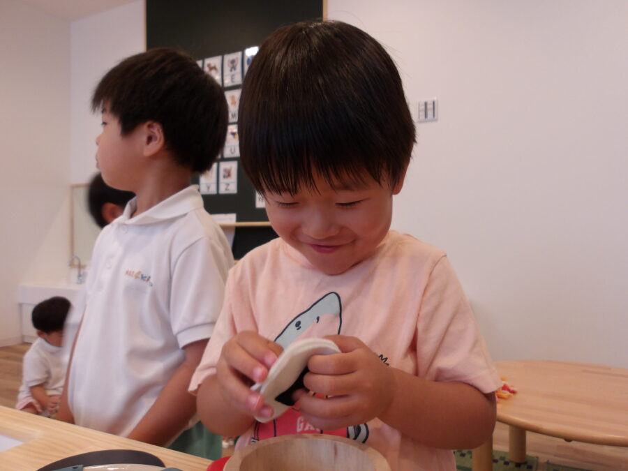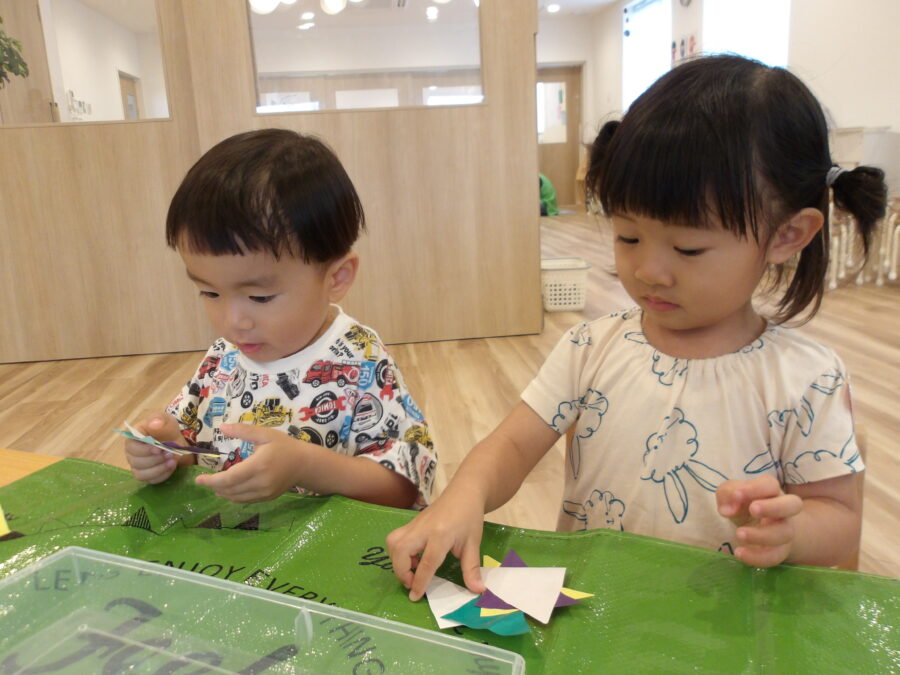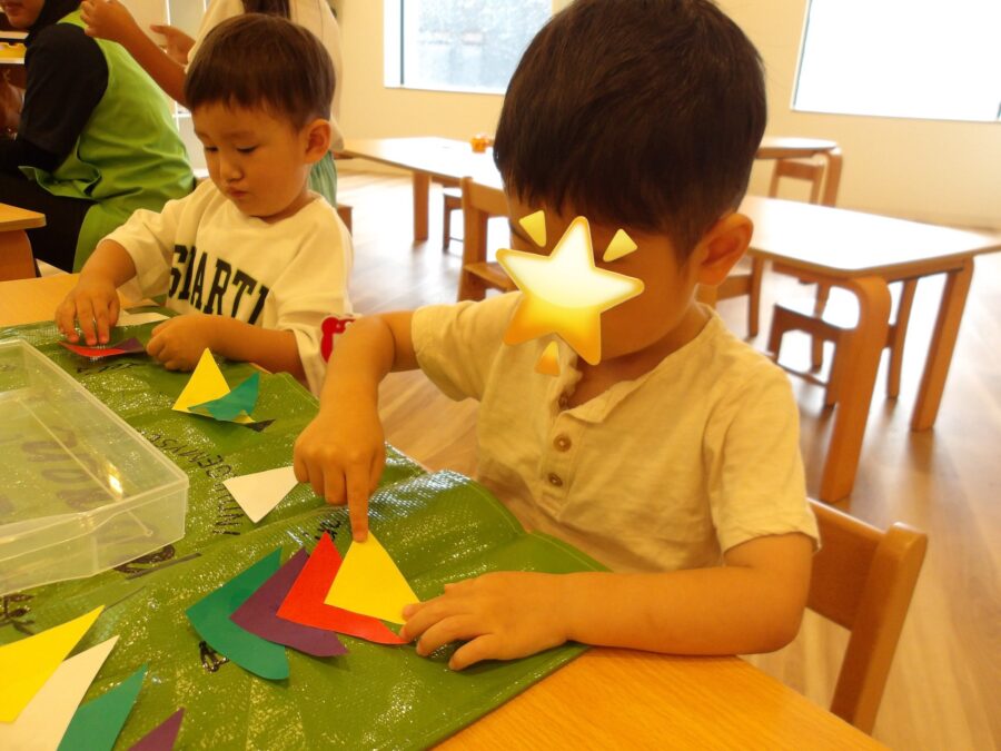 「どうやってやるのー?」と話していましたが、保育者から作り方を教えてもらい、作り方が分かると、「もう一個作ってもいい!?」と沢山作ろうとする姿がありました。
