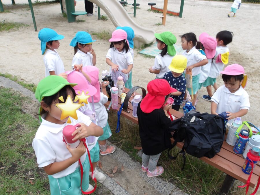 友だちがお茶を飲んでいることに気づき「僕も!」とみんなで飲んでいました。