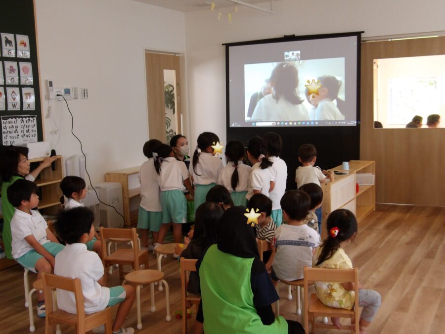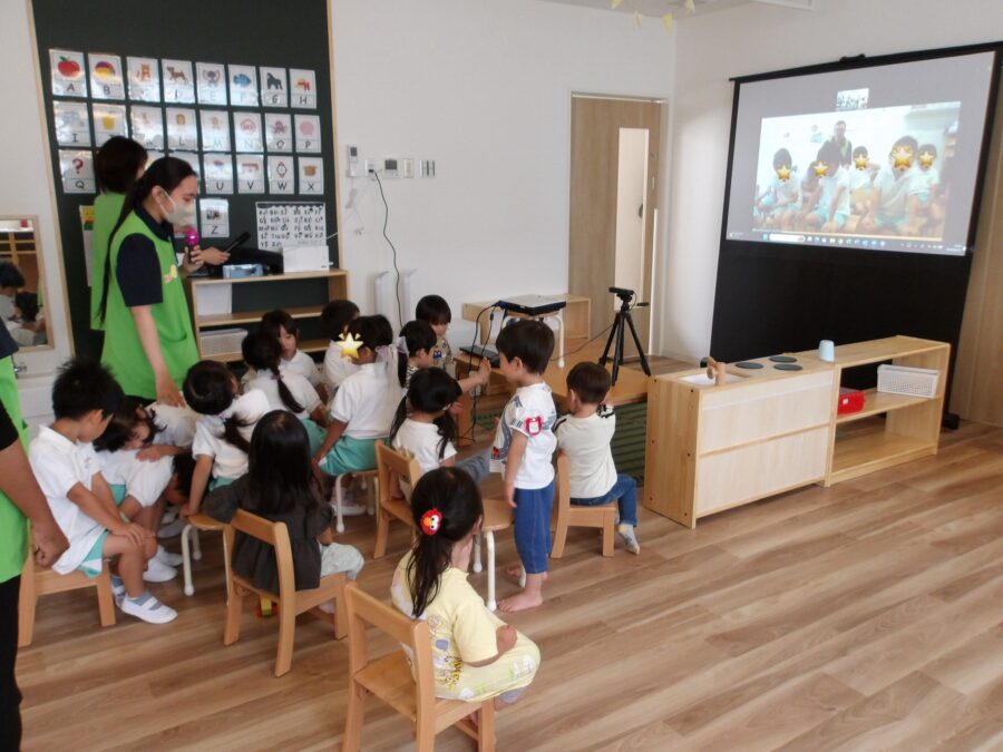 そら組がリトミックを楽しんでいる間、隣の部屋ではテレビ電話を繋いで、ナーサリースクール塩釜口のお友だちと『こんにちは!』👦🏻👧🏻👋🏻