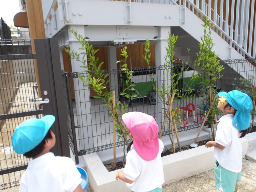 チョウを捕まえようとする子どもたちに「卵を産みに来たのかな」と保育者が話すと、「(葉っぱにいる)幼虫を見に来たんじゃない。あの蝶々はお母さんなのかも!」といい、捕まえるのをやめてじっと目で追いかけていました。