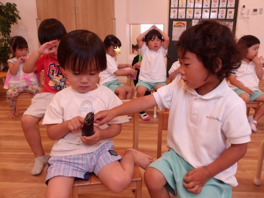 塩釜口のお友だちが保育室で飼っているカブトムシを紹介してくれて、「わ〜すごいね〜!」と大盛り上がり!