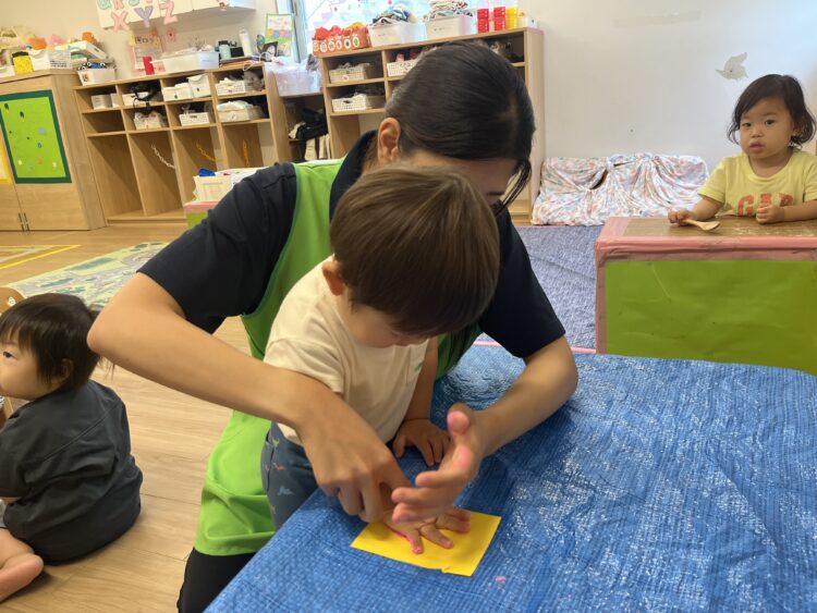 こちらでは、手に絵の具をつけて、紙にペッタン🖐️