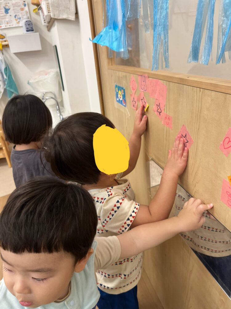 誰が1番高い所に貼れるかな、、、一生懸命背伸びをして貼っていました😊