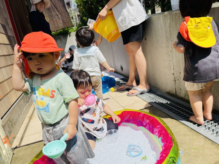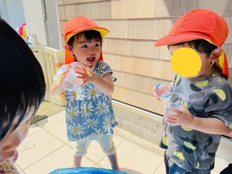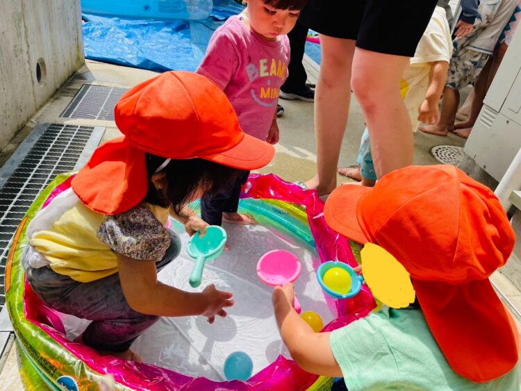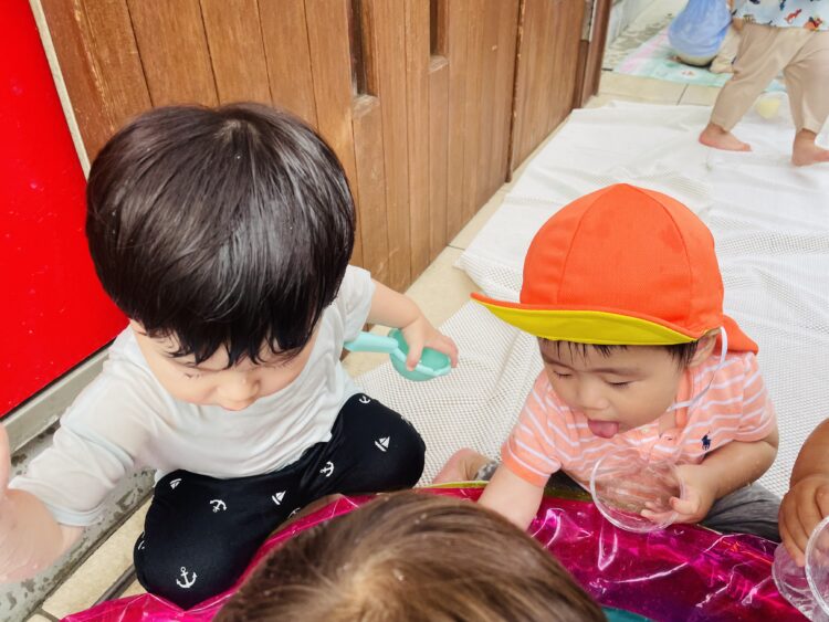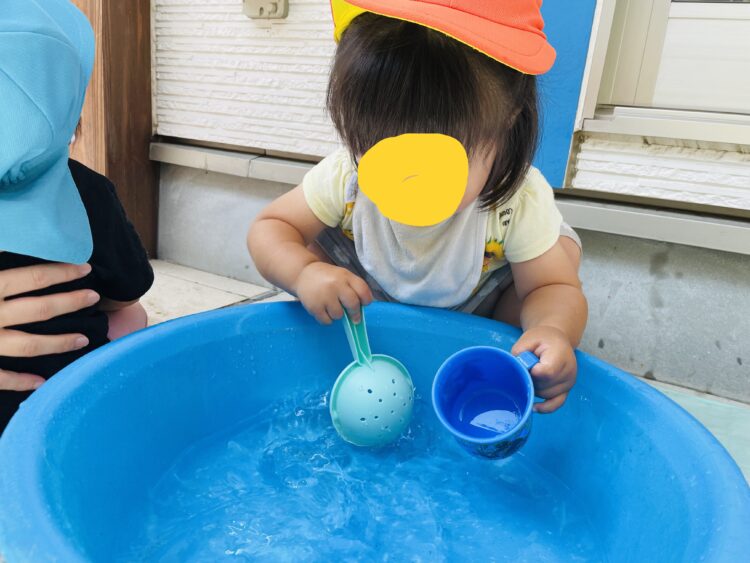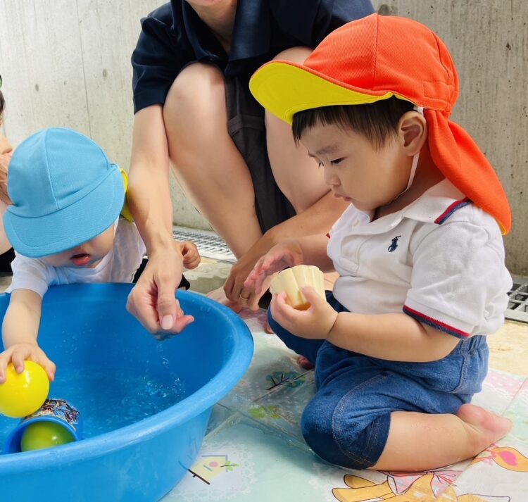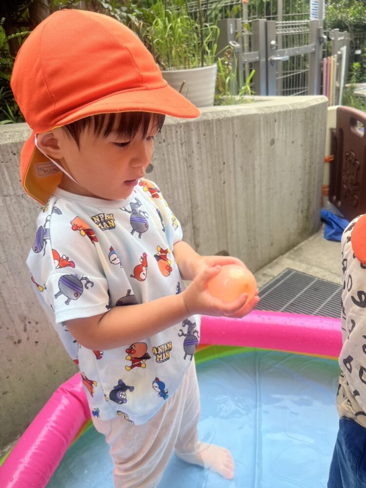 おもちゃを持って、お水を注いでみたり、カラーボールを持ってみたりと、お水の実験です🧐🧪