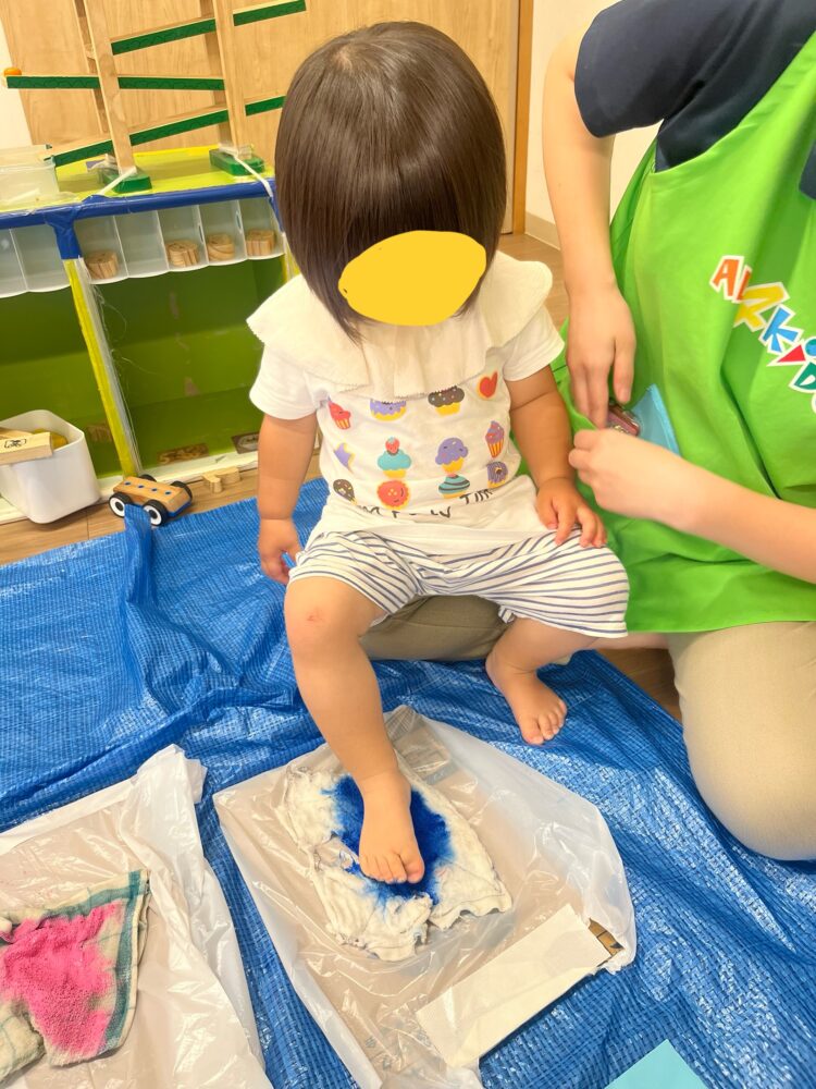 ビニールシートをひいてから、青色とピンク色の好きな方を選んでもらってぺったんしました🦶
