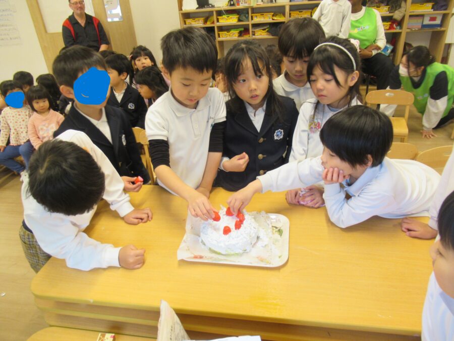 クリームをのせて最後はぞう組さんがいちごのトッピングをして完成![]()