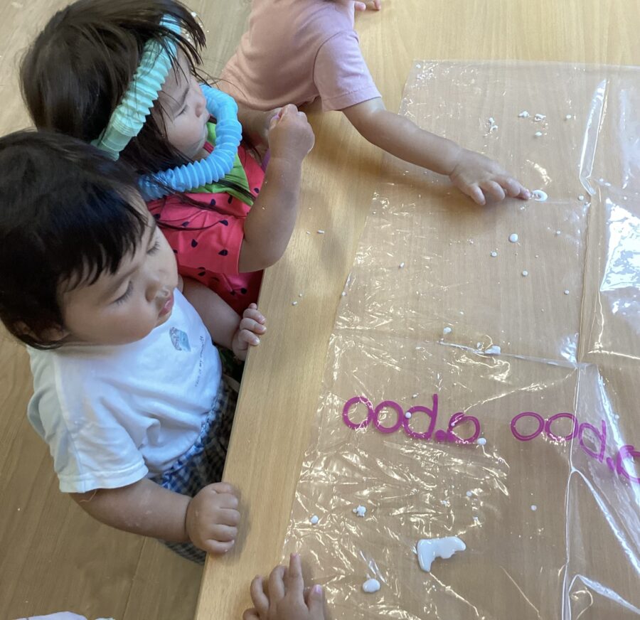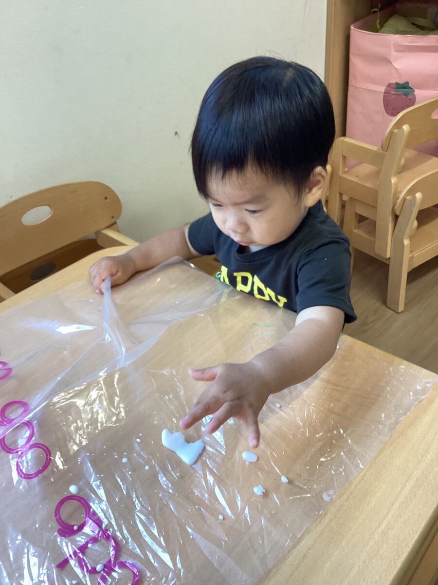 片栗粉とお水を溶かした感触遊びをしました!
