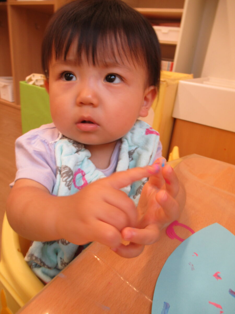 手に付いた絵の具を不思議そうに見たり