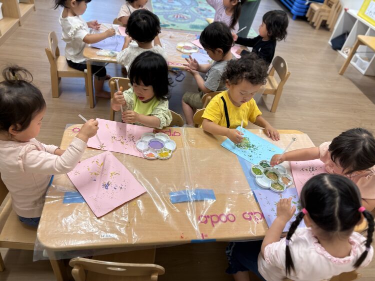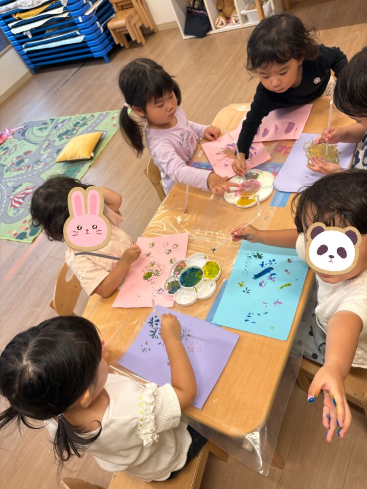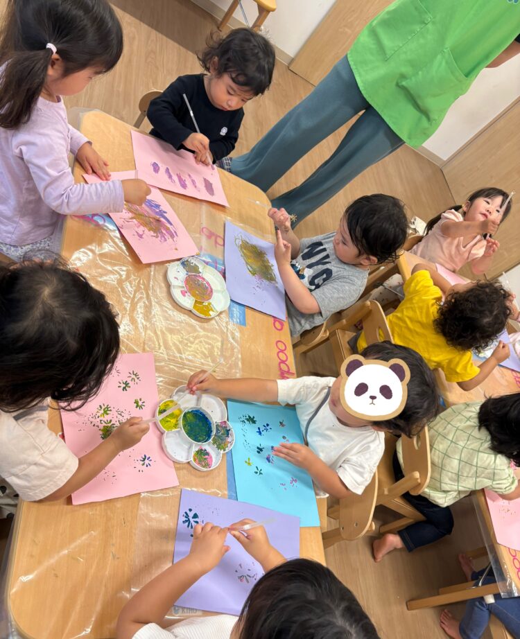 今日は、お部屋で絵の具とストローを使いペタペタして遊びました。ピンク、あお、黄色の色を使いましたが、…混ぜ混ぜして何色になったのかな❓