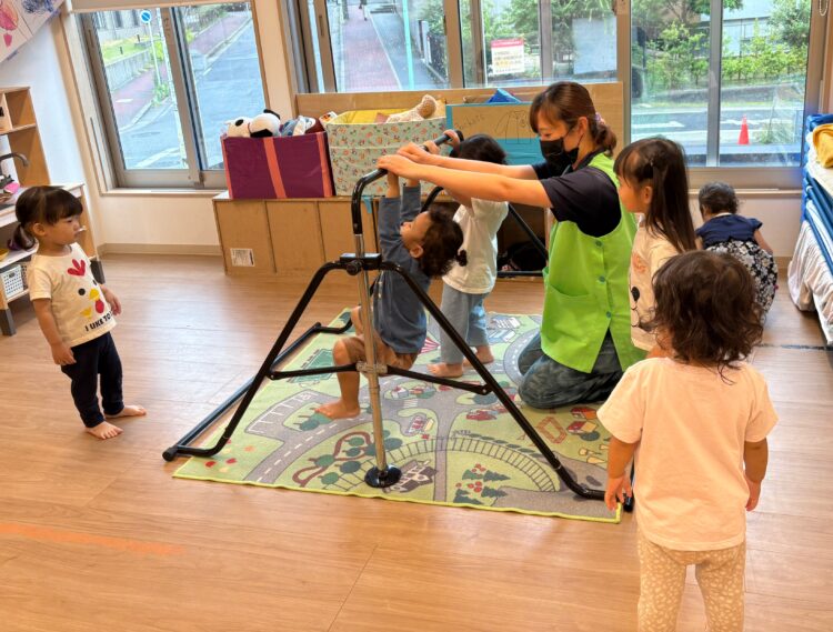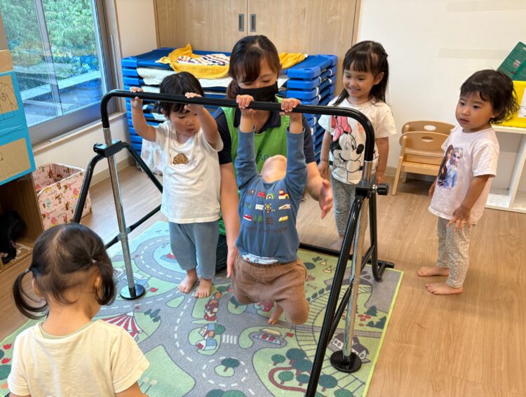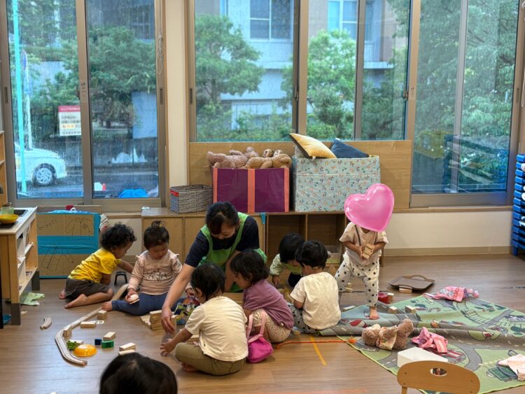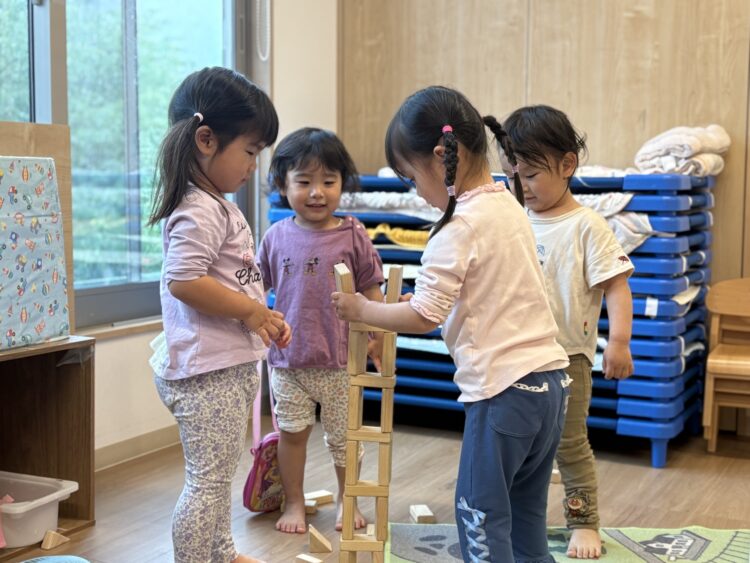 絵の具のあとは、みんなで積み木を高く積み上げたり、ならべたりして遊びました🙌