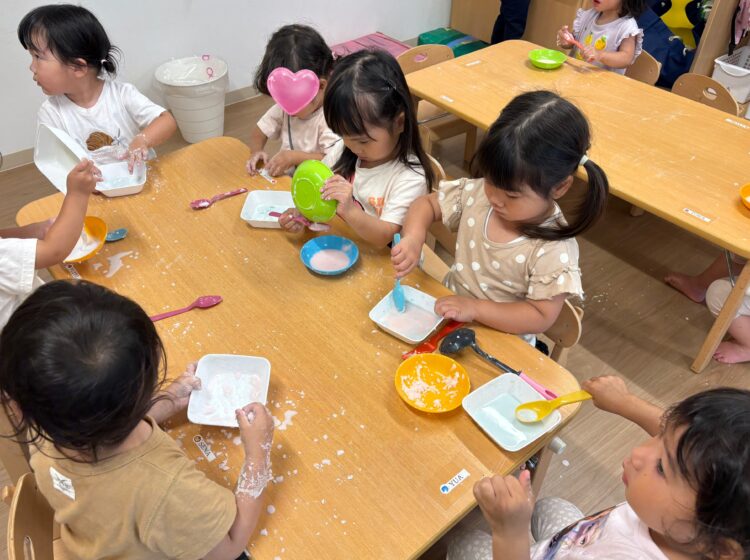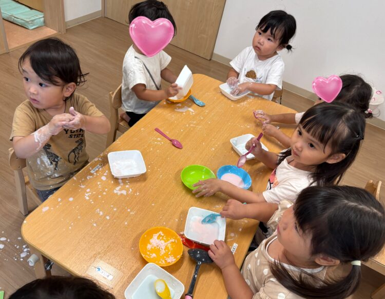 今日は、片栗粉に色水を混ぜて感触遊びをしました。