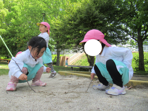 地面にお絵描きするお友だち♬