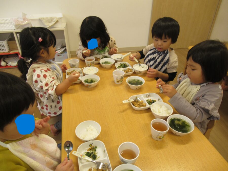 体操教室に公園遊び。たくさん身体を動かしたあとはみんな大好き給食の時間。