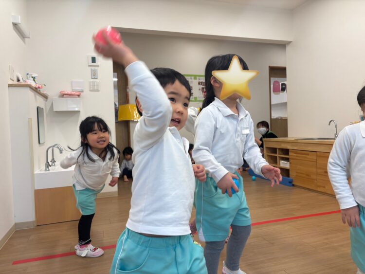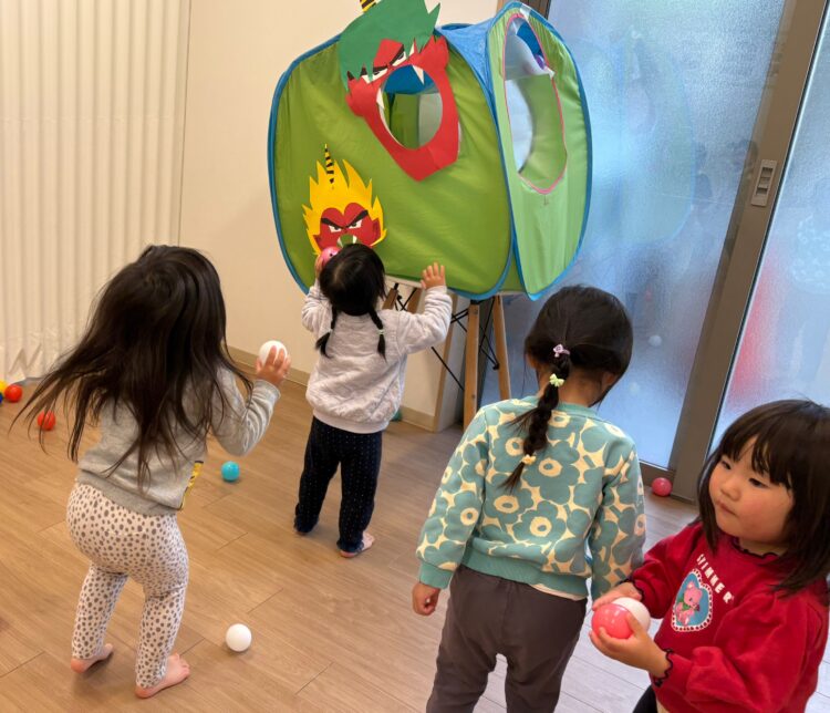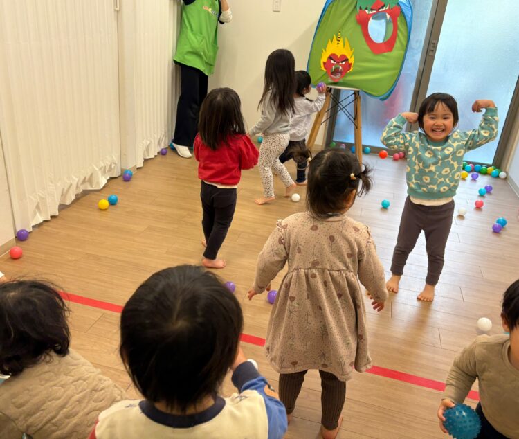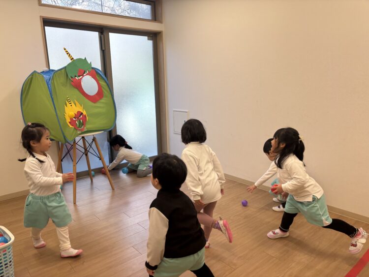 「鬼は外〜、福はうち〜🎶」みんなで、ボールを鬼にぶつけてやっつけました✨