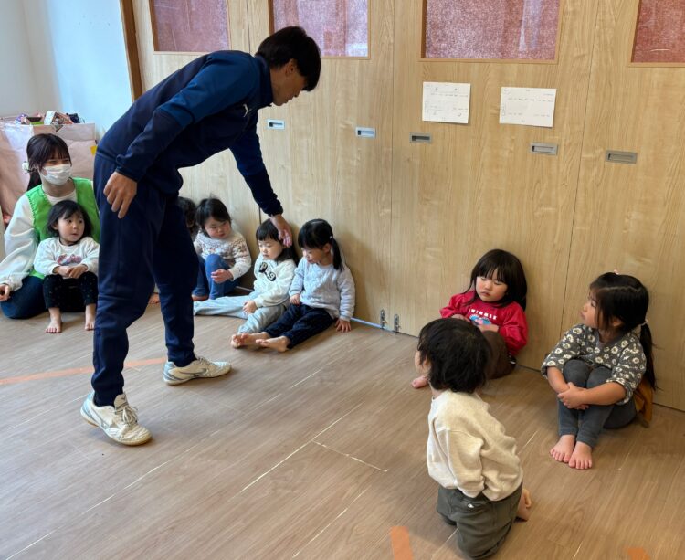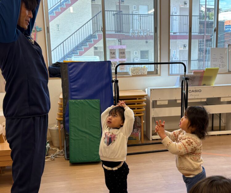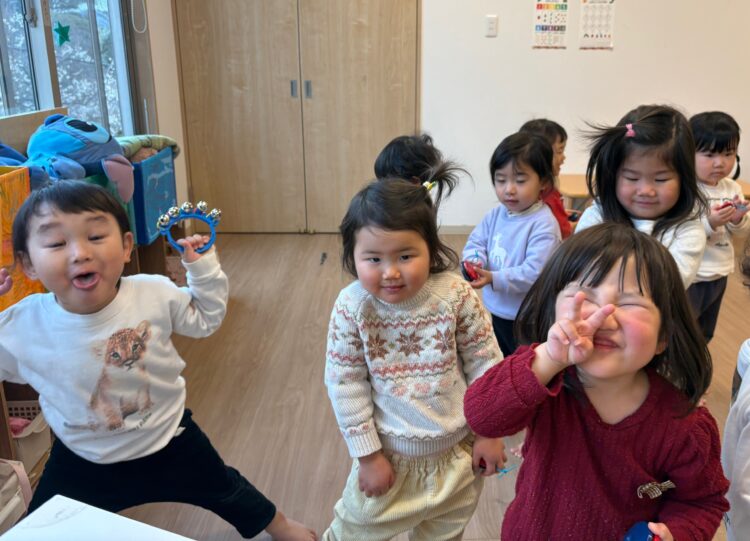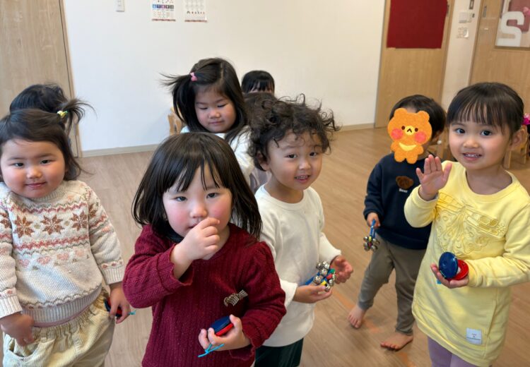 今日は、幼児クラスの発表会を意識して、「すず」「カスタネット」を使って、リズム遊びをしました。