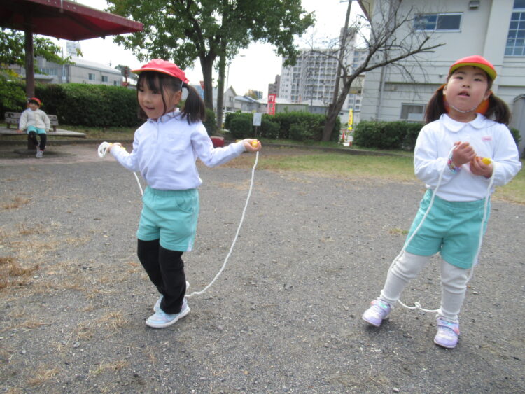その次は友だちが動かす縄を歩いたり跳んだりして通っていきます