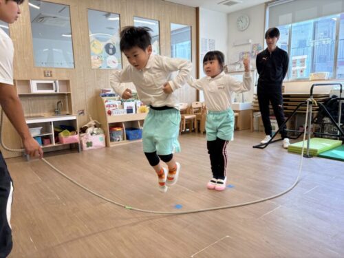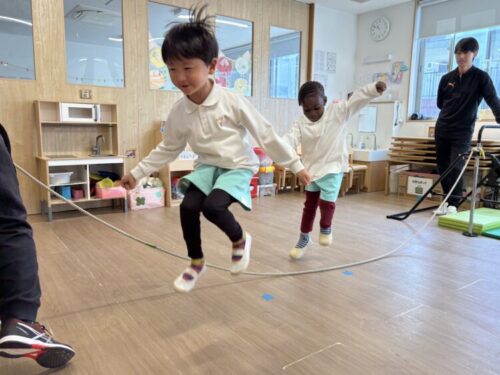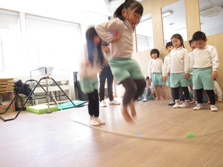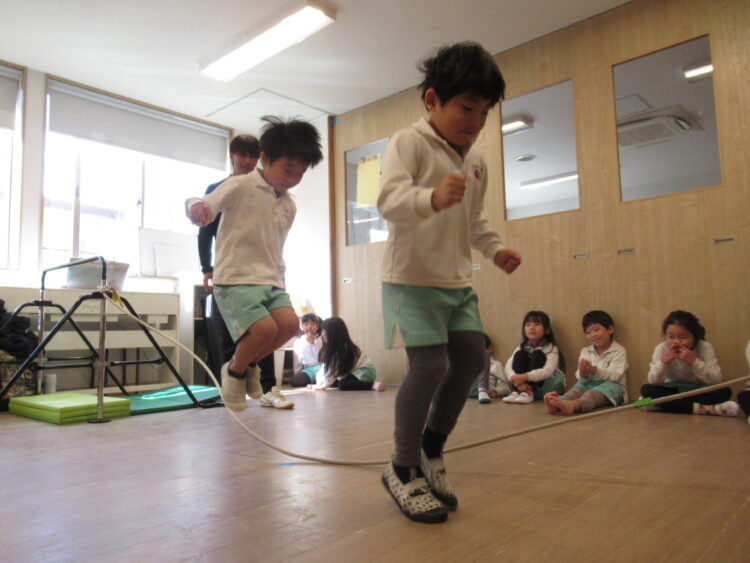 それまで跳べていたみんなも縄が一周するとちょっぴり怖いようで近づいてくる縄から後退りする場面も…!