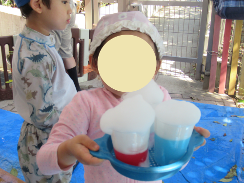 色水の上に泡を乗せてフラペチーノのような飲み物が完成✨