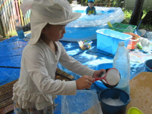 大きな氷の塊を水で溶かして遊ぶお友だち★