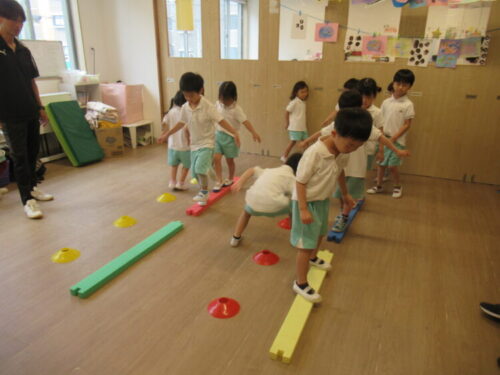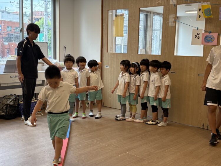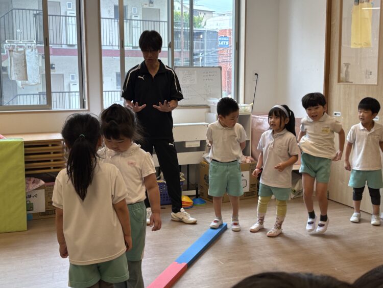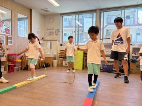 今日の体操教室では、ロープの端を持って平均台を歩きます👣