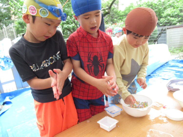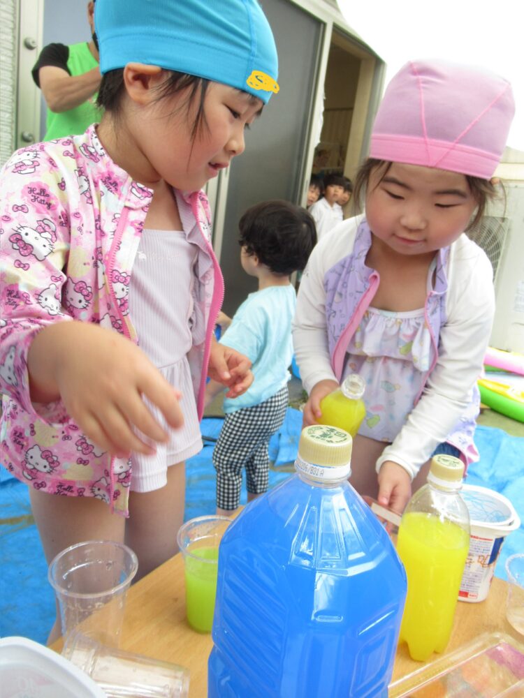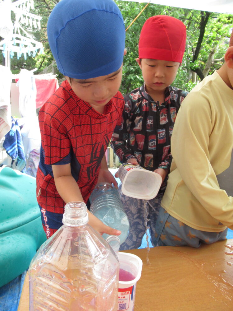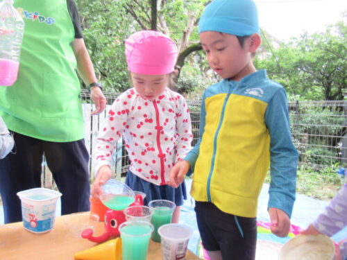 ピンクと緑の色水を混ぜるとどんな色になるかな~?✨