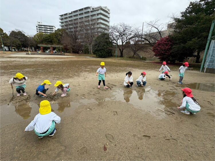 前日の雨でできた水たまりで泥遊びをするお友だち★