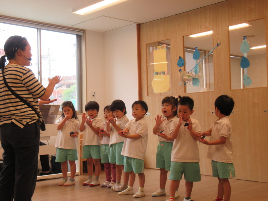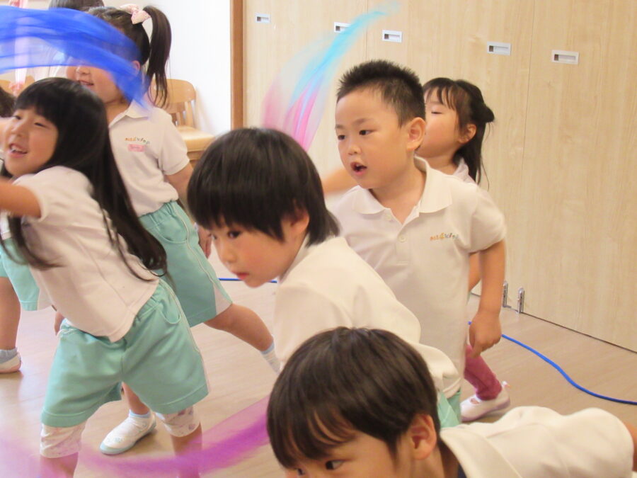 プール遊びをした後は、リトミック🎶ふわふわの布を使って雨や水を表現したり…