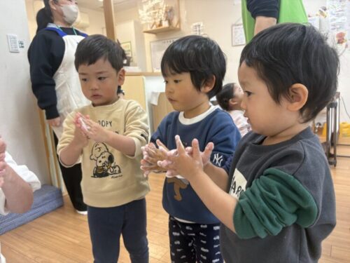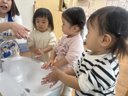 手洗いの歌を教えてもらって、それに合わせてゆっくりと手洗いの練習をしました!
