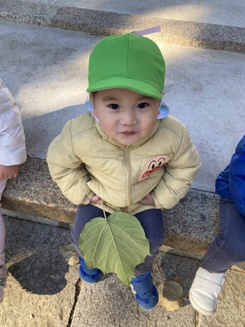 木の実をたくさん拾ったり、大きい葉っぱに穴を開けてもらってお面のようにして楽しんだり、松ぼっくりや石を拾って楽しみましたよ😊