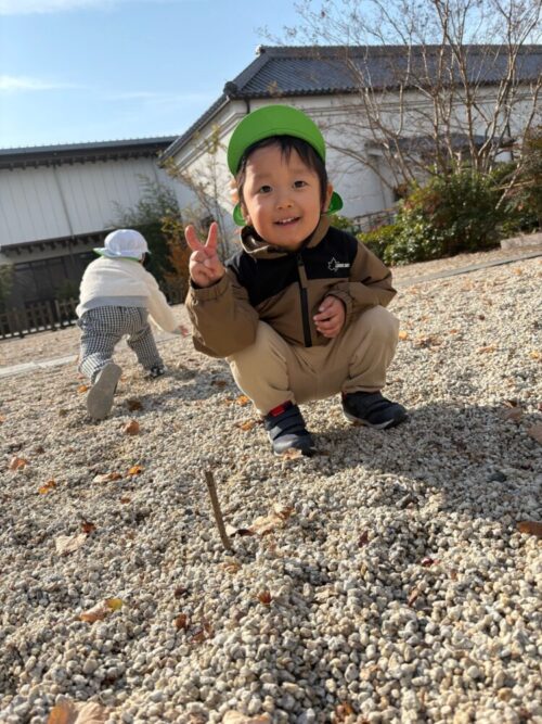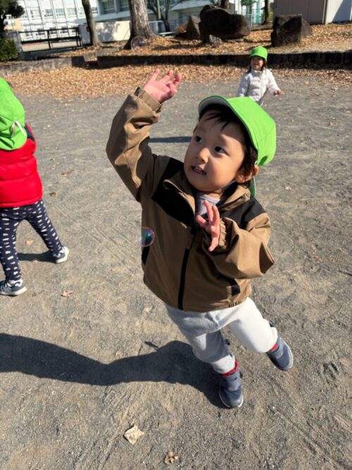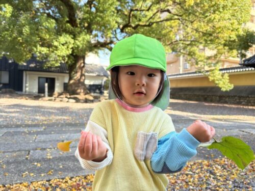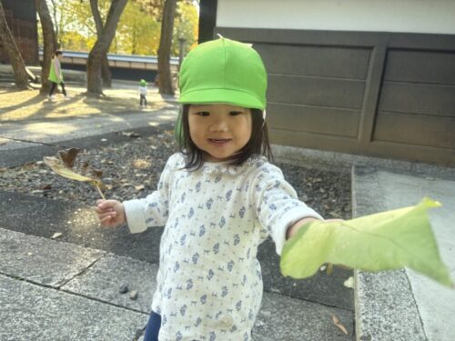 イチョウの葉っぱで先生が蝶々をつくると上手に動かして遊んでいましたよ😊(上記の写真)