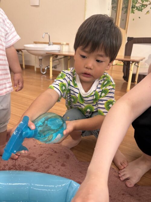 ピュ〜ッとお水が出て、先生にかけたりお友だちにかけたりして楽しんでいました😊