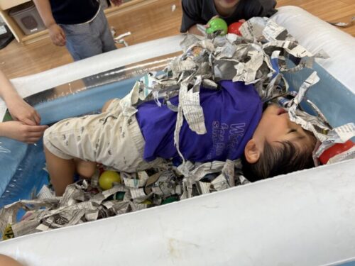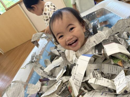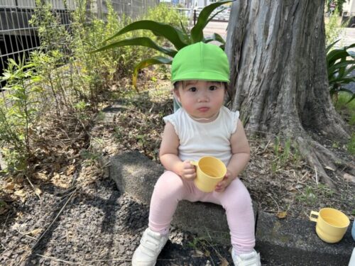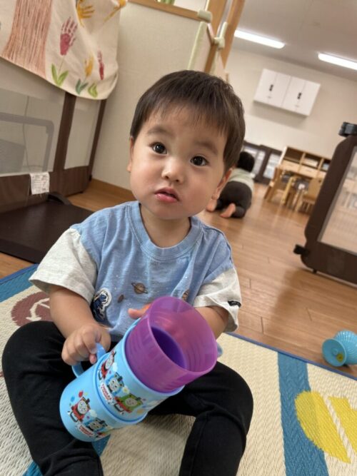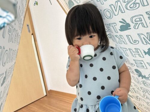 コップでジュースを飲む真似をしたり、お皿に食べ物を入れてお料理ごっこをしたりと楽しんでいましたよ!