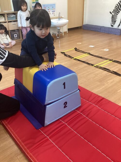 跳び箱に登って、少しずつおしりを前に動かして進みました!