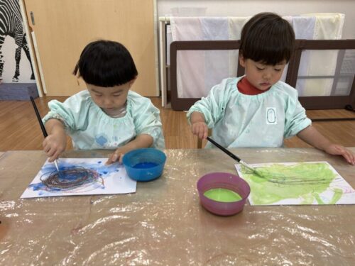 もも組さんは、クレヨン🖍️でお絵描きをし、その上から絵の具を塗って、はじき絵をしました🎵