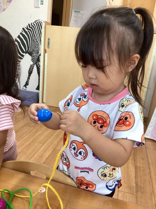 今日は牛乳パックの積み木とひも通しで遊びました!
