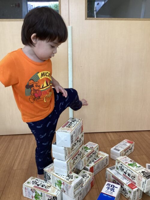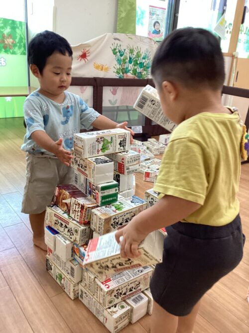 牛乳パックの積み木ではおうちを作って遊んでいると、