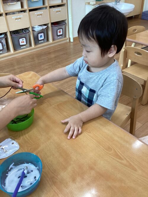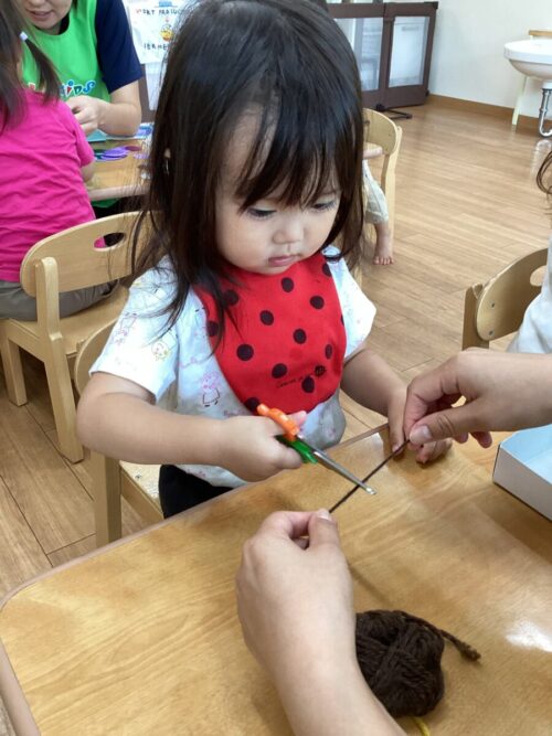 2歳児さんは毛糸をはさみでチョッキン✂と切り、切ったものを紙皿に貼ります😄