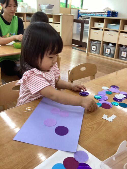 1歳児さんは丸く切ったものをたくさん貼り、個性のあるぶどうができました🍇