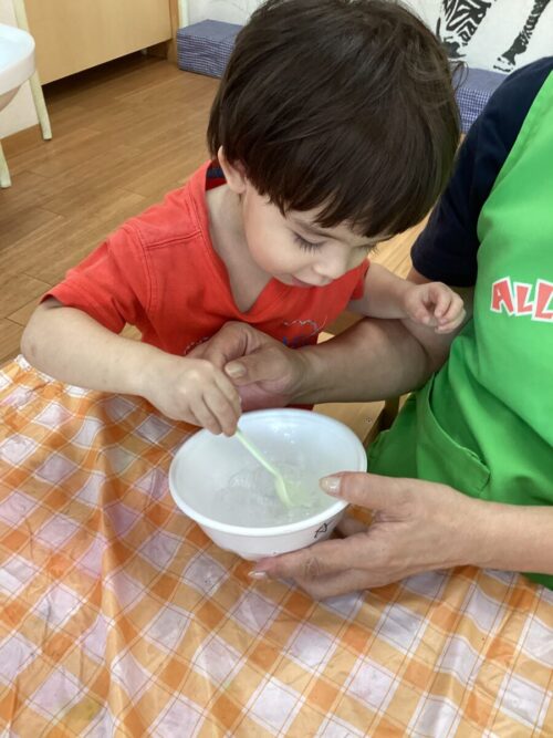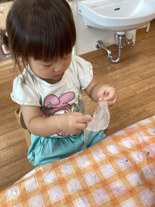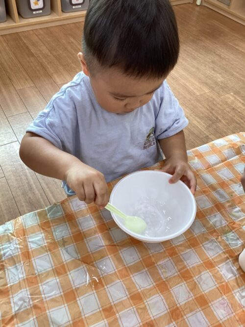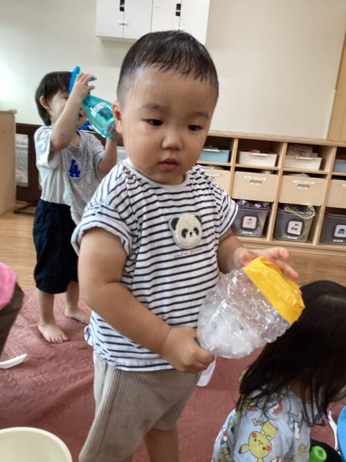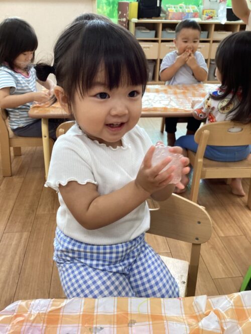 触って冷たさを感じたり、氷とお水をコップに入れてジュースやお茶を作ったりして楽しんでいましたよ😊