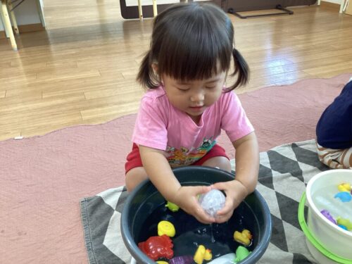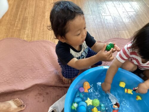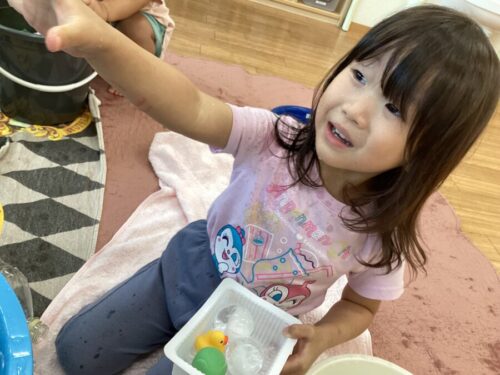 暑いから、お水で遊ぼう💦とお部屋の中で水遊びをしました💦