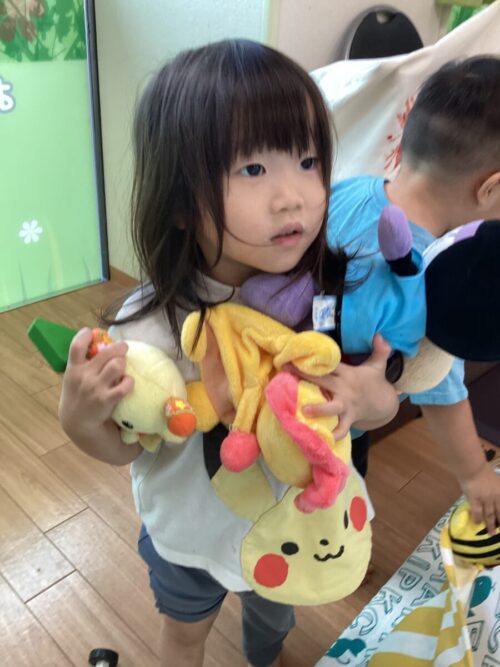 ぬいぐるみをたくさん抱えて遊んでいました😊